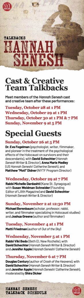 Nominated for a Drama Desk Award for best solo performance (Lori Wilner), this electrifying solo play with music brings to life the extraordinary true story of Hannah Senesh — a fearless young Hungarian woman whose courage defied tyranny. As World War II looms, Hannah leaves her home to help build a Jewish state, only to later parachute behind Nazi lines on a daring rescue mission to save her fellow Jews — including her own mother — from the horrors of the Holocaust. A stirring portrait of resistance, resilience, and hope, this one-woman tour de force is as inspiring as it is unforgettable. More information at nytf.org